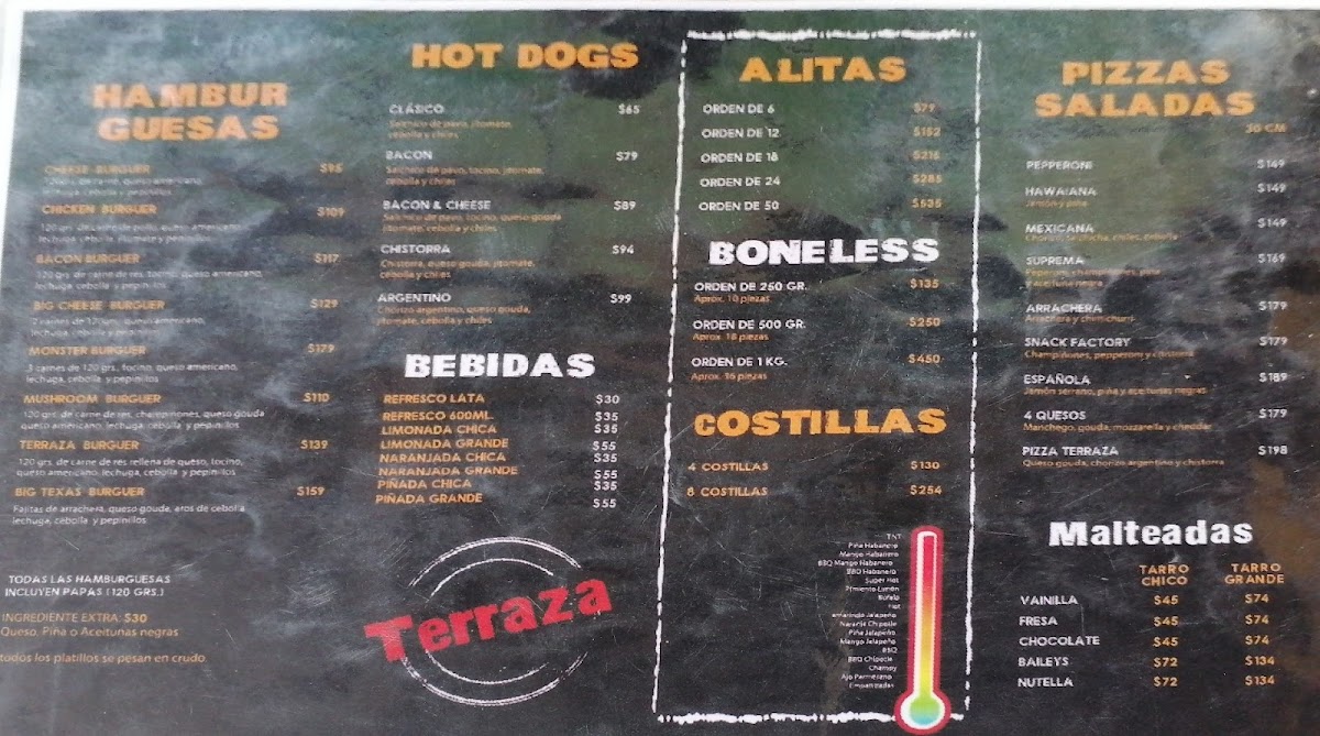 Introducing Terraza, a culinary gem located in Pachuca de Soto, Mexico. This vibrant eatery specializes in hearty fare that perfectly blends flavors and comfort. The menu boasts a variety of hamburgers, including the classic Cheese Burger and the bacon-packed Bacon Burger, each served with crispy French fries. For wing lovers, the boneless options are a must-try, available in different sizes with a choice of delectable sauces.